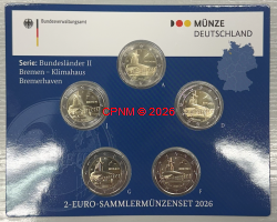 ALLEMAGNE, 2 € commémorative 2026 "Bremen", série des 5 ateliers monétaires (A, D, F, G et J) sous étui BU.
