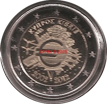 CHYPRE, 2 € commémorative 2012 "10e anniversaire de l'Euro", colorisée.