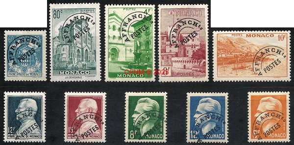 MONACO, Préos n° 1/10, timbres divers surchargés, série complète (10 val.), TB **
