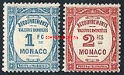 MONACO, timbres-taxe émis en 1932 : 1 F bleu et 2 F rouge, type "Recouvrements". Tirages :13 200 exemplaires pour le 1 franc, 11 400 pour le 2 francs. Ce sont les plus faibles chiffres de tirage de tous les timbres taxe de MONACO. Etat : TB **