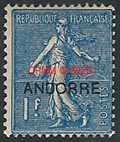 1 F bleu, type "Semeuse" lignée, surchargé "ANDORRE".